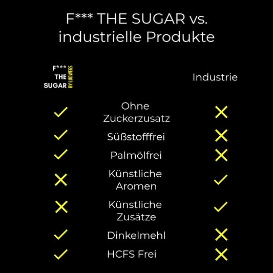 F*** THE SUGAR steht für Produkte die zu 100% keinen zugesetzten raffinierten Zucker enthalten.