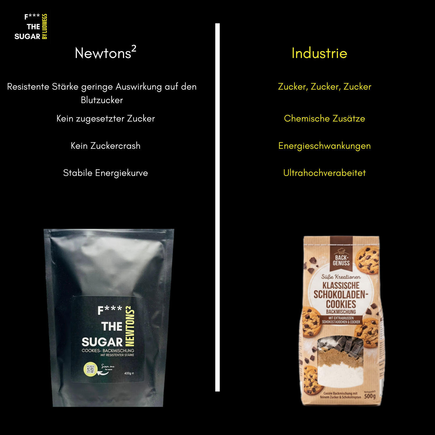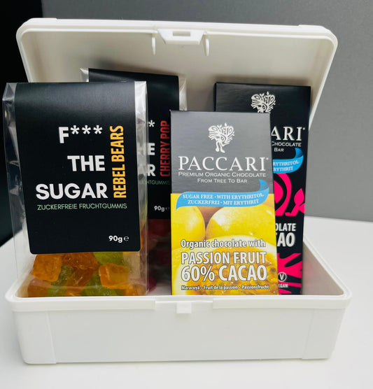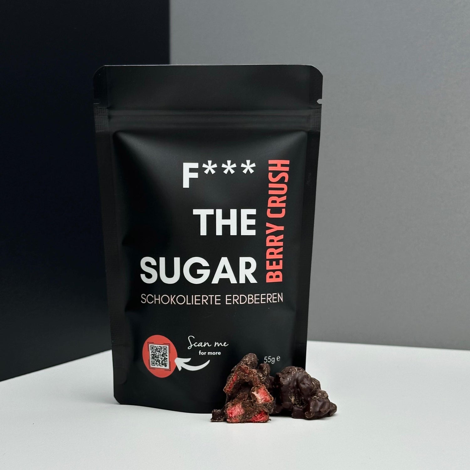 F*** THE SUGAR steht für Produkte die zu 100% keinen zugesetzten raffinierten Zucker enthalten.