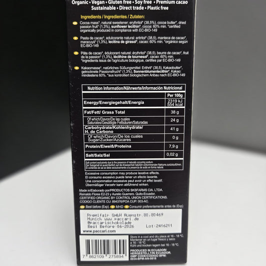 PACCARI | Zuckerfreie Bio Schokolade Maracuja | Ecuador | 60% Kakao