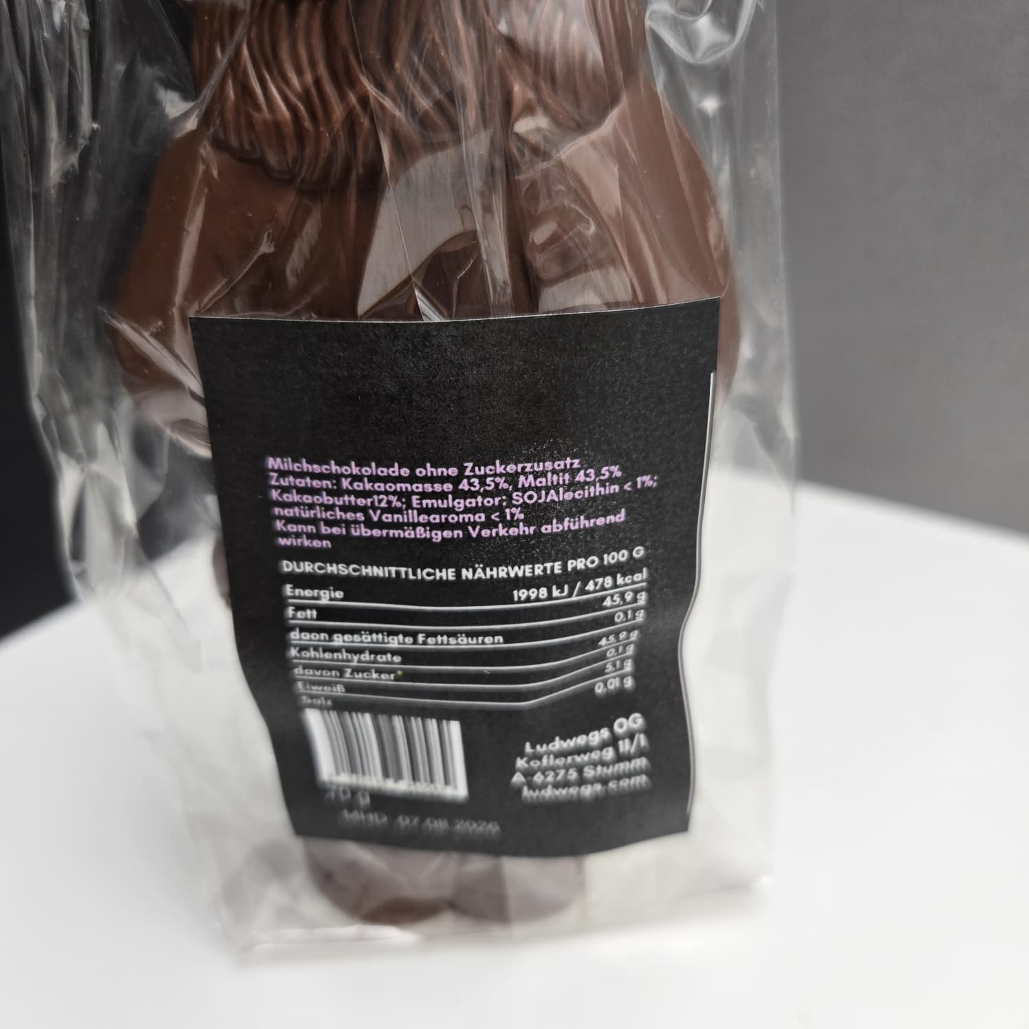Milchschokolade ohne Zuckerzusatz Zutaten: Kakaomasse 43,5%, Maltit 43,5 %, Kakaobutter 12%; Emulgator; SOJAlecithin < 1%; natürliches Vanillearoma < 1% Kann bei übermäßigen Verzehr abführend wirken