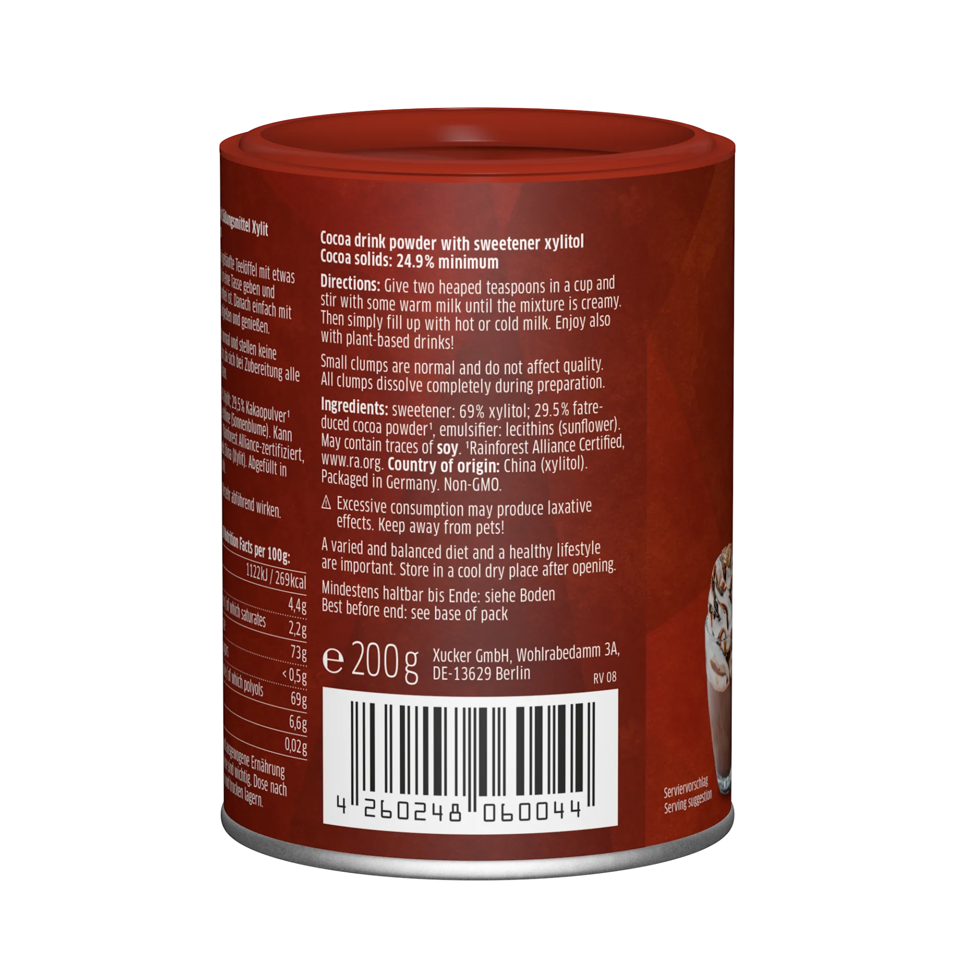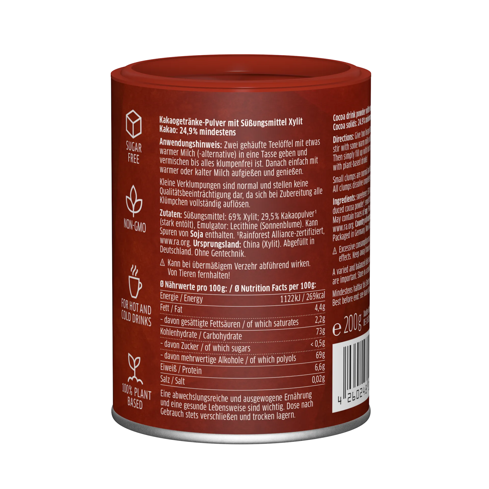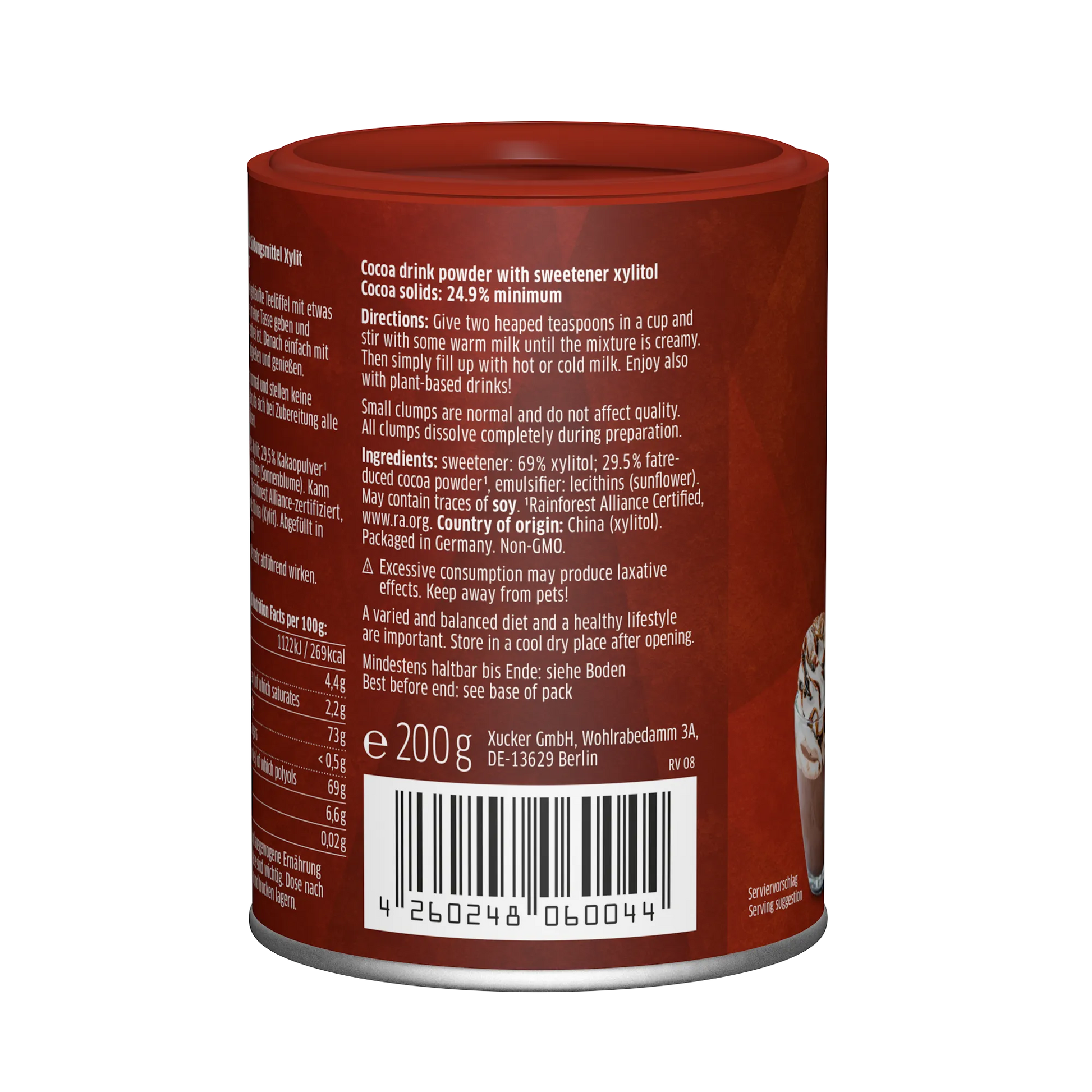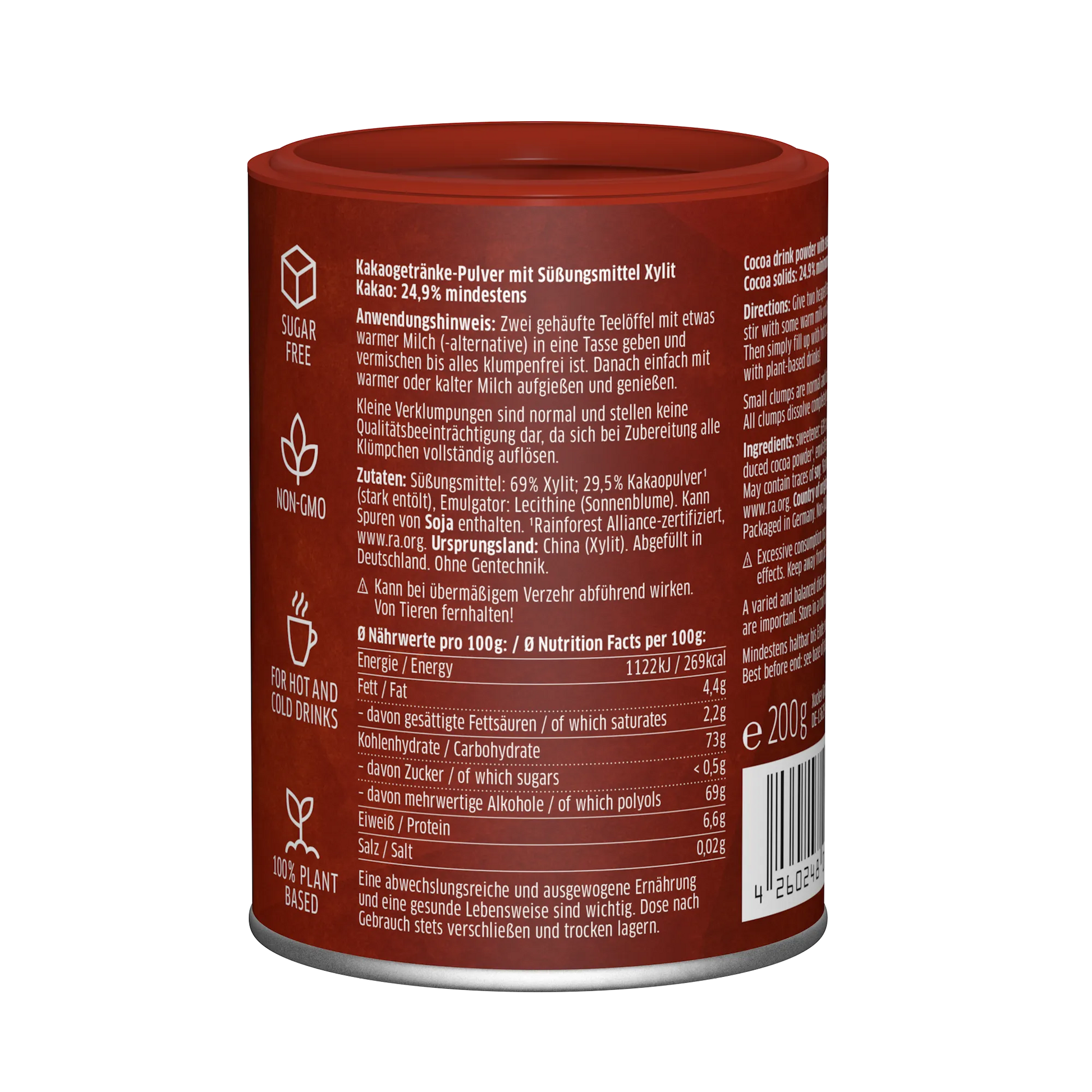 Kakaogetränke-Pulver mit Süßungsmittel Xylit. Kakao: 24,9% mindestens.